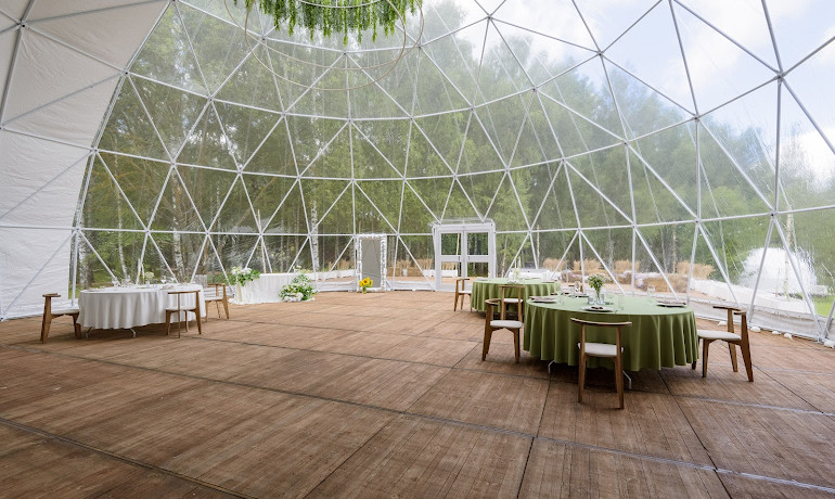 Загородный комплекс "Green place" с шатром и открытыми террасами расположен в селе Большие Яки в пригороде Казани.